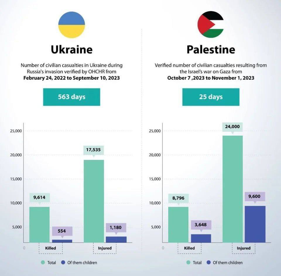 Ниже приведена инфографика потерь гражданского населения в военных конфликтах на территории Украины и Палестины.