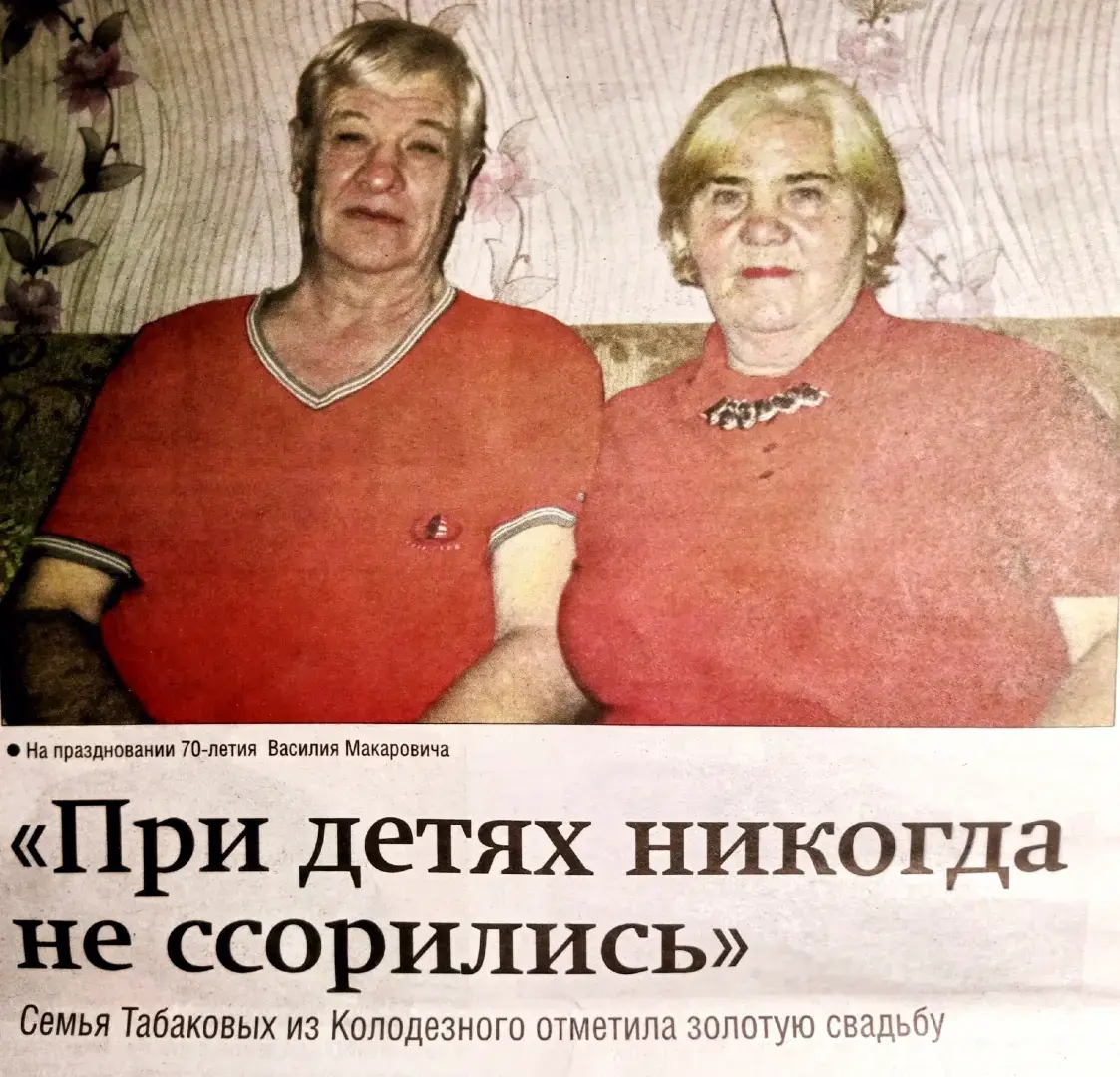 Василий и Любовь Табаковы из посёлка Колодезный, Воронежской области 30 октября отпраздновали золотую свадьбу, 50-летие совместной жизни. Сейчас Василию Макаровичу - 74 года, а Любови Васильевне - 76 лет. Их сыновья уже давно самостоятельные люди, у них свои семьи и дети. За время совместной жизни юбиляры золотой свадьбы выдержали и удары судьбы, и бытовые неудобства, и вынуждены переезд из Киргизии в Россию, но благодаря взаимному уважению и нежной привязанности друг другу победили все испытания.