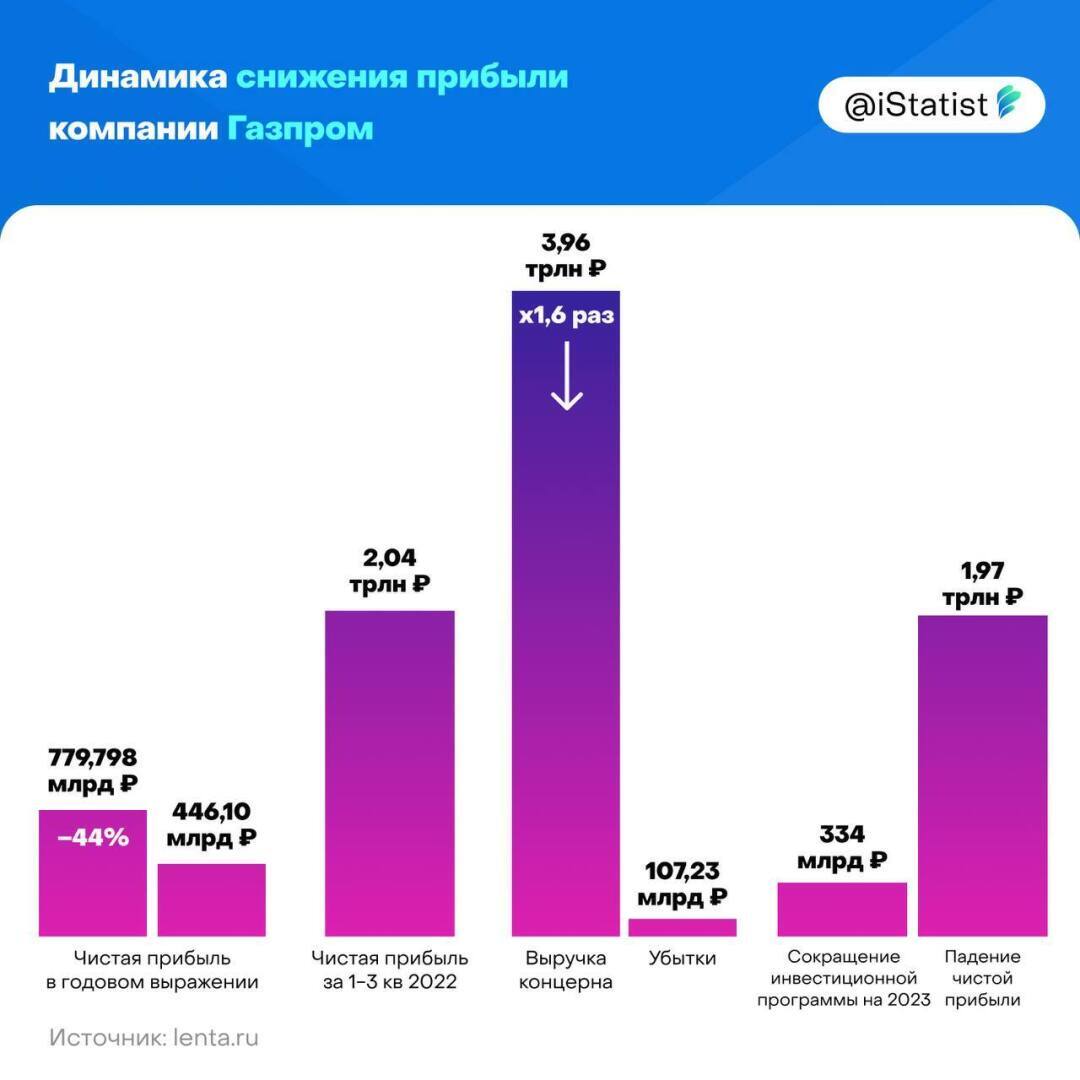 Чистая прибыль «Газпрома» рухнула почти в два раза. Чистая прибыль «Газпрома» рухнула на 44 процента за десять месяцев 2023 года. В годовом выражении, с 779,798 миллиарда рублей до 446,103 миллиарда.