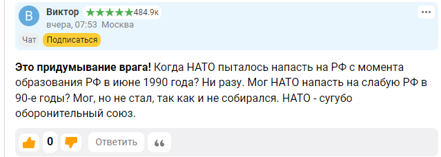 Это придумывание врага! Когда НАТО пыталось напасть на РФ с момента образования РФ в июне 1990 года? Ни разу. Мог НАТО напасть на слабую РФ в 90-е годы? Мог, но не стал, так как и не собирался. НАТО - сугубо оборонительный союз.