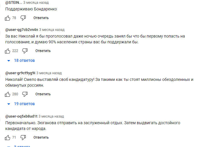 Действительно, Николая Бондаренко многие люди уважают и поддерживают. Также депутат от КПРФ не стесняется в выражениях и говорит, как есть. Если мы возьмём прошлые выборы 2018 года, то от партии КПРФ кандидатом выступил Павел Грудинин. На минуточку собрал больше 11,79% и занял второе место.