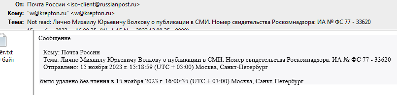 Чтобы заострить внимание АО "Почта России" к проблеме, поднятой в моем открытом письме в ДИТ (копия в "Почту России") я решил отправить по электронной почте письмо со ссылкой на эту статью в "Почту России".