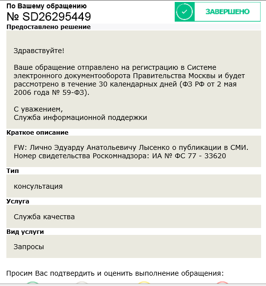 Для информации сообщаю, что мое обращение в ДЗМ часом ранее было отправлено Почтой России Электронным Заказным Письмом с электронным уведомлением о вручении.