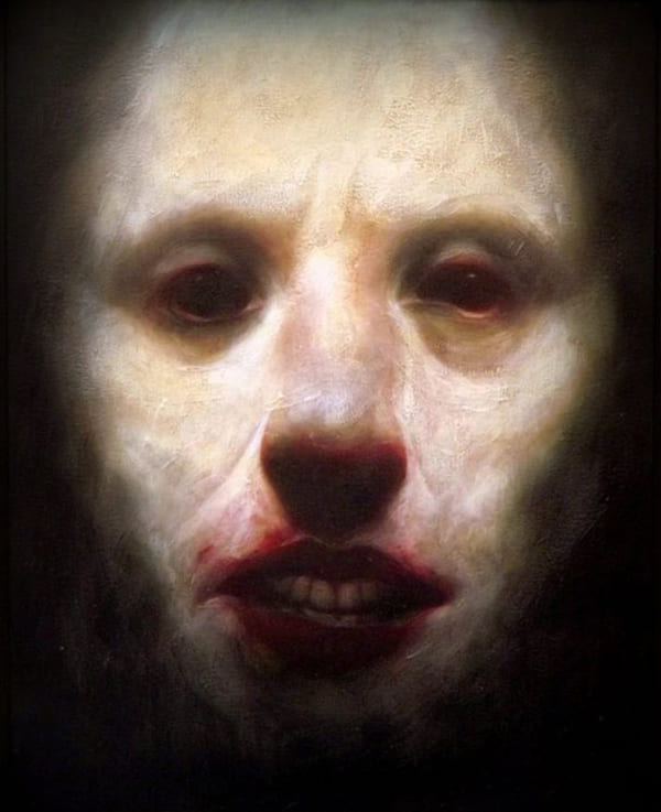 Белёсая кожа, темные глаза и кроваво-красные подтеки на губах - так можно описать эту картину. Как думаете, почему художник увидел себя в таком образе?
