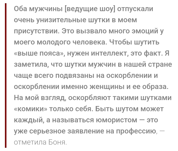 Известная модель и блогер Виктория Боня не стесняется высказывать свое мнение о различных ситуациях и людях. На этот раз она обратила внимание на шутки, которые ведущие вечернего "Шоу Воли" Павел Воля и Илья Соболев отпускали в ее присутствии. Она назвала эти шутки унизительными и заявила, что из-за участия в этой программе поссорилась со своим молодым человеком, Русланом Гасановым. Однако, несмотря на это, Боня подчеркнула, что не обиделась и не отреагировала на эти унизительные колкости со стороны своих коллег
