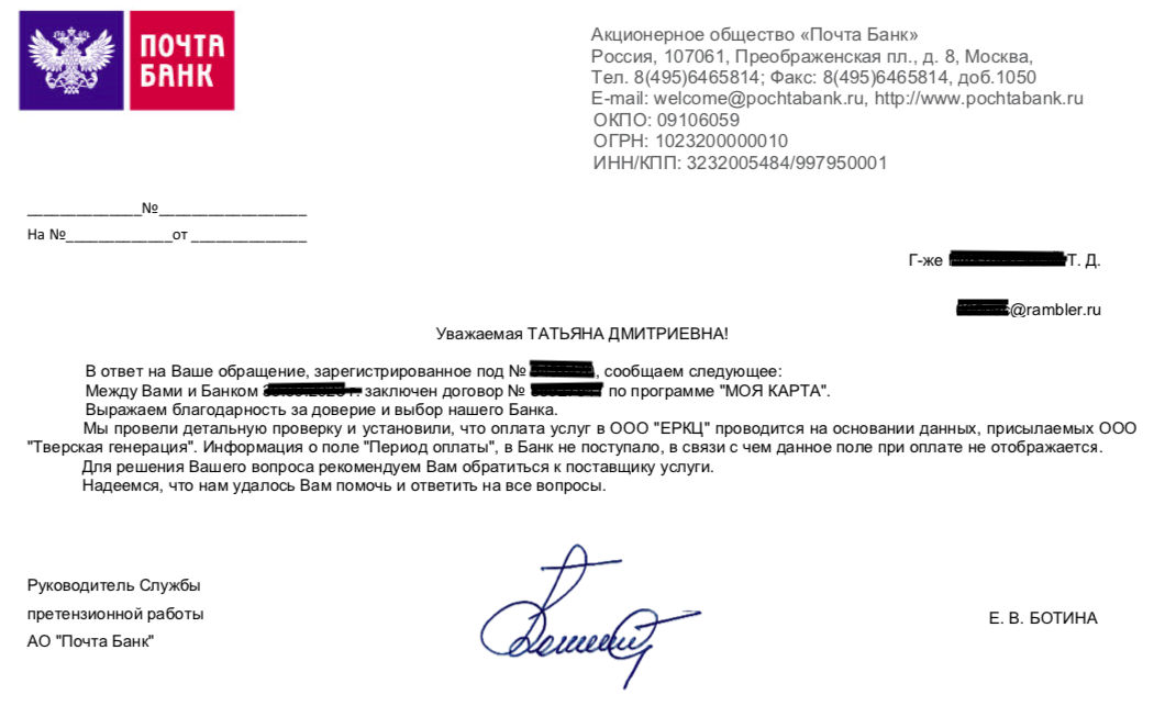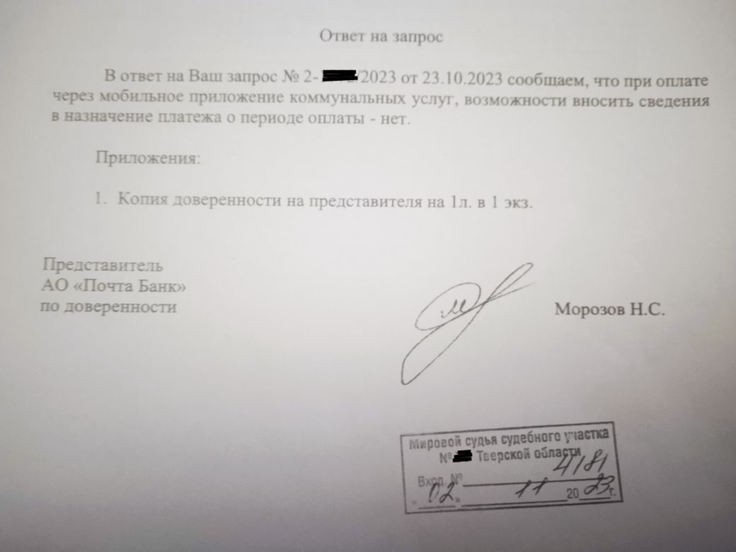 Судебное заседание началось с того, что я предоставила суду ответ от "Почта Банка", что действительно, при оплате услуг нет графы период оплаты.