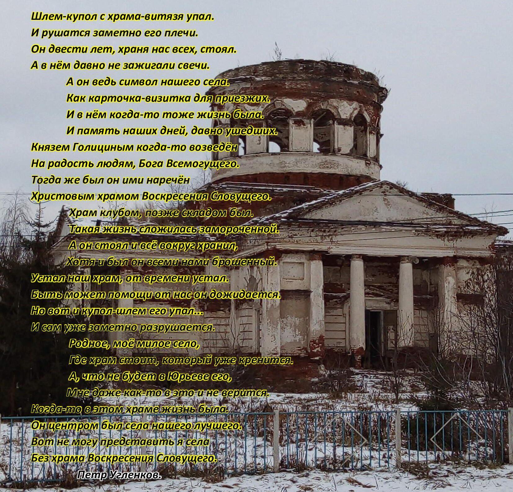 О заброшенном храме с. Юрьева говорят лишь молчаливые стены и лишенный купола небосвод. Однако, если прислушаться внимательно, можно услышать зов души, интенсивный и трогательный, который несет в себе просьбу о возрождении и возвращении духовной красоты, заполнявшей это светлое и могущественное место древних времен.