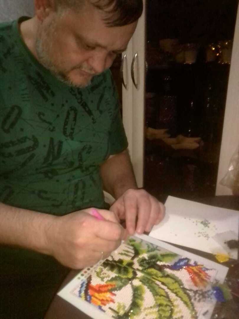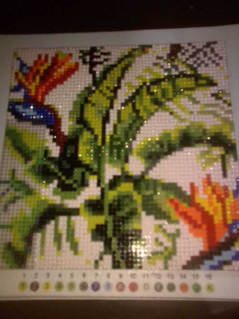 Я сделал алмазную картинку. Ничего сложного. Сиди и собирай по цветам. Жене очень понравилось.