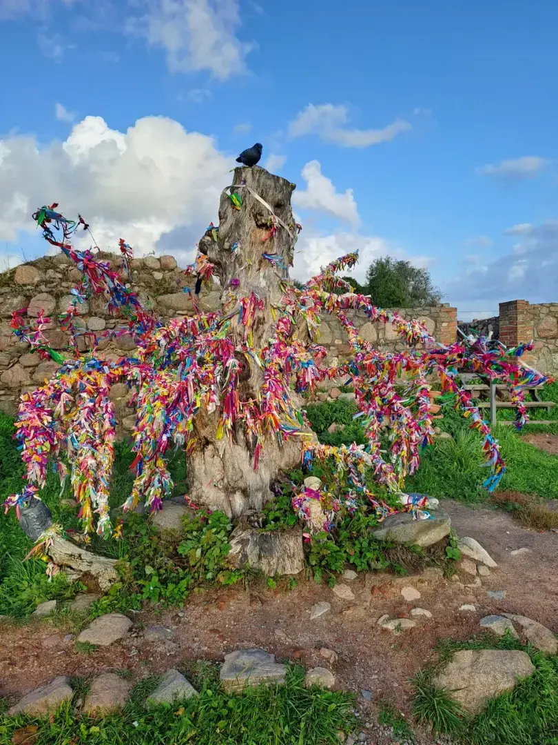 На территории замка есть бесплатный вай-фай, но мы им не воспользовались. При входе стоит дерево желаний, оно с ленточками, и вокруг куры... Много кур и один петух!
