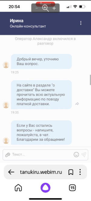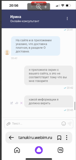 Вначале на просьбу вычесть из заказа стоимость доставки, как об этом заявлено на официальном сайте, было напечатано следующее:
