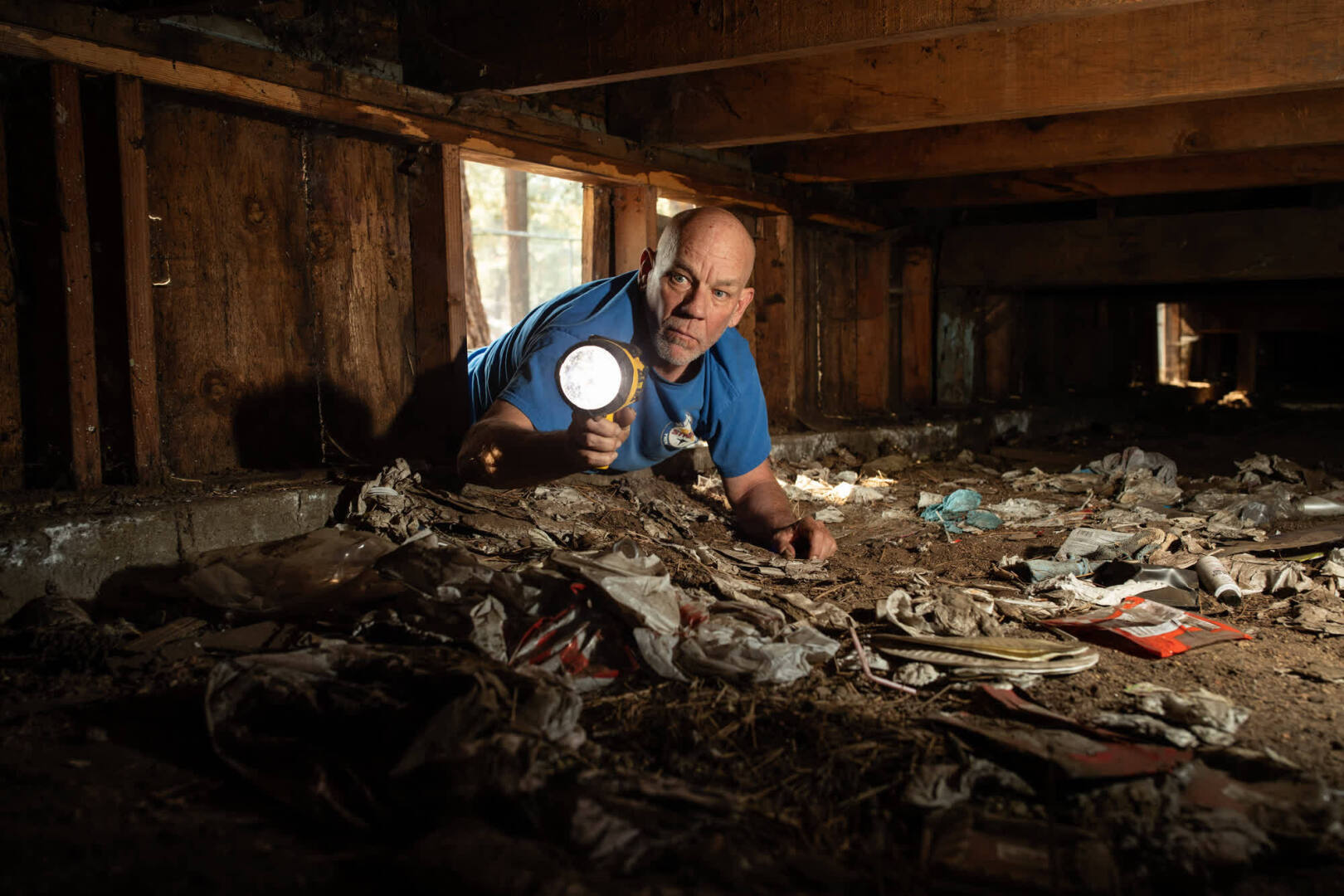 Гигантский черный медведь вылезает из щели под заброшенным домом в Саут-Лейк-Тахо, Калифорния. Его шерсть переливается во вспышке камеры, цвет чего-то среднего между цветом сухих сосен, растущих вдоль земли, и отслаивающейся ржаво-красной краской дома позади.