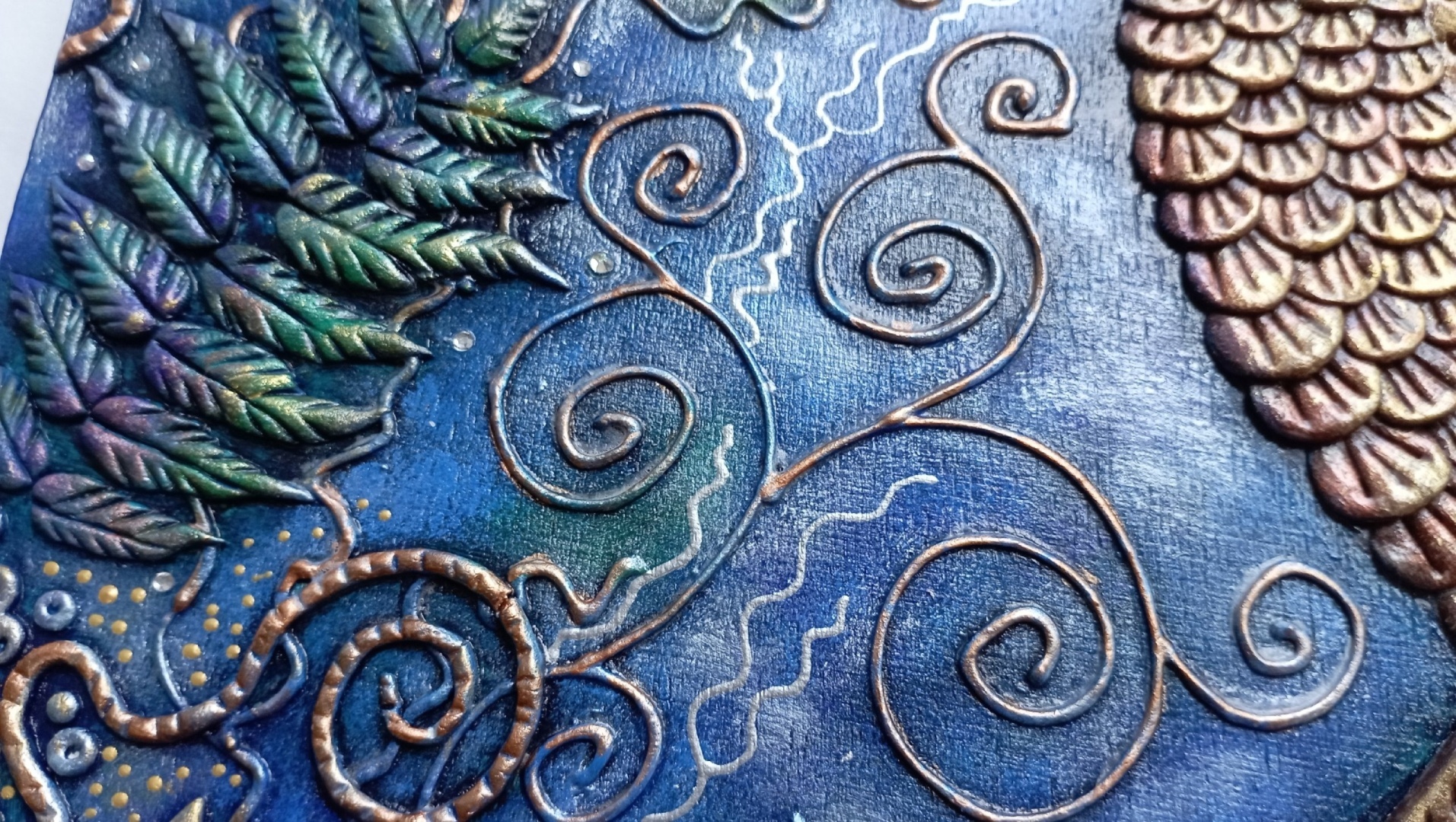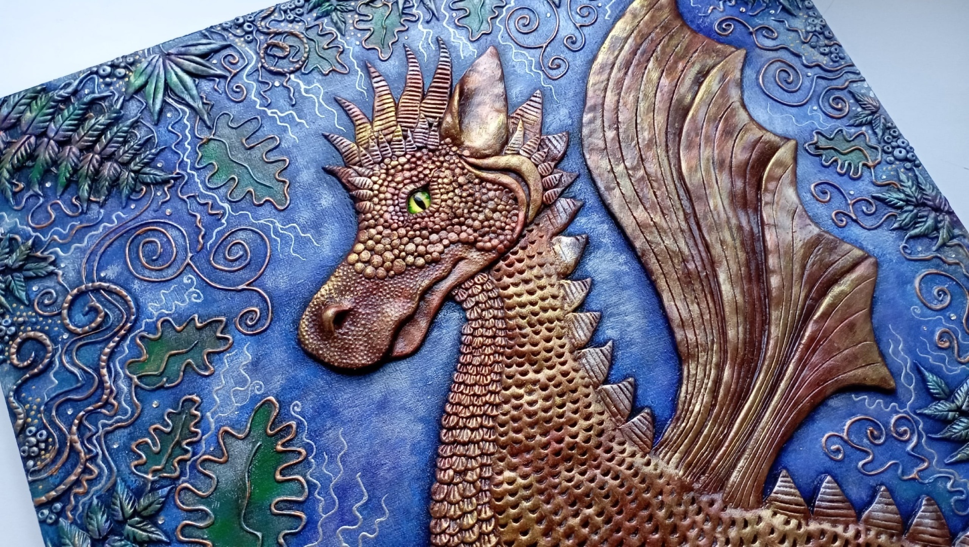 Дорогие друзья! Рада представить мою очередную работу, в которой присутствует символ 2024 года. Это объемная картина "Дракон". Мне очень нравится делать такие объемные картины, поскольку здесь совмещаются два вида творчества - лепка и рисование. Работа выполняется на деревянном планшете. Сначала я создаю объемные элементы из самозатвердевающей массы на основе шпаклевки и столярного клея, затем раскрашиваю картину акриловыми красками.