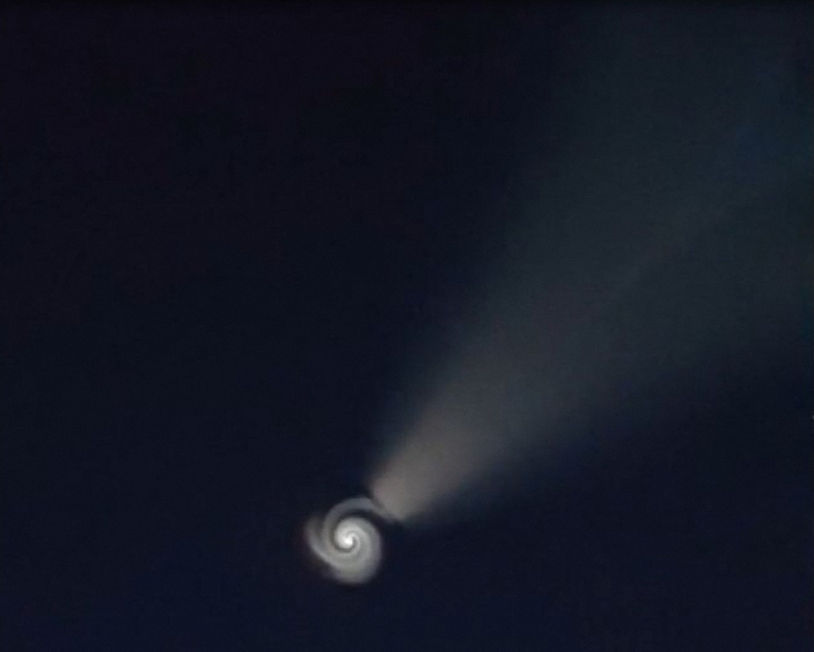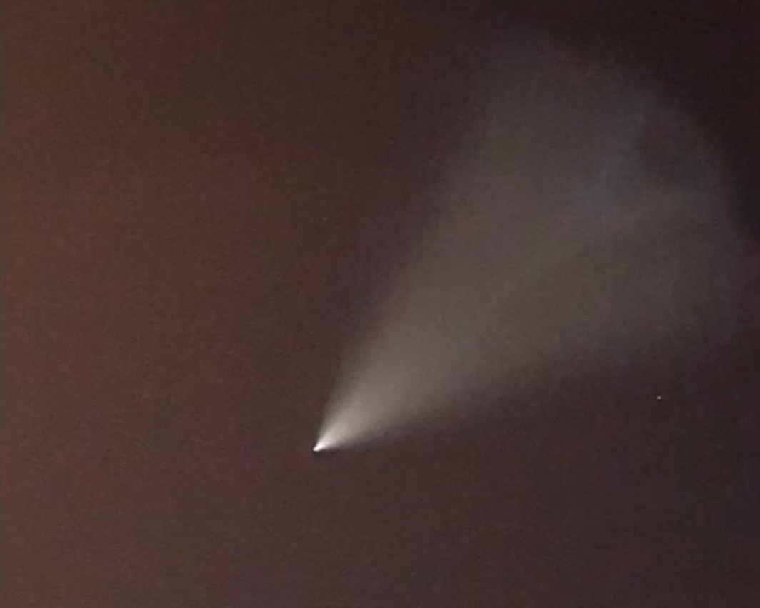 Лично видел такой лучь, только мощнее раза в три и до самой земли. Неслышал, про какие либо источники питания созданные человечеством, по весу которые способны к поднятию в воздух и питающие такие мощные прожектора.