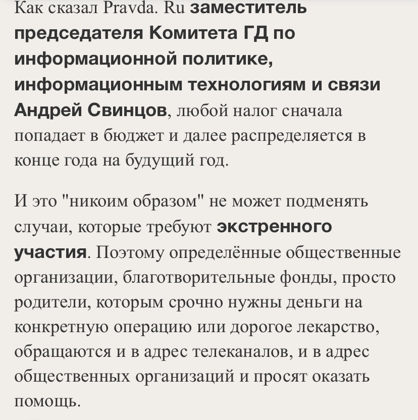 Налоговые деньги как мы все знаем идут в федеральный бюджет и не предусматривают таких целей как срочное выделение их на операции и лечение детей. Привожу утверждение депутата: