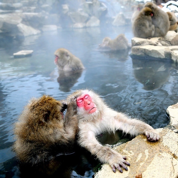 Главная достопримечательность Джигокудани – это горячие термальные источники, которые обезьяны используют для купания и согревания в строгих зимних условиях. Японские макаки, которые называются снежными обезьянами, могут выдерживать температуру ниже -15 градусов, благодаря своему густому меху.