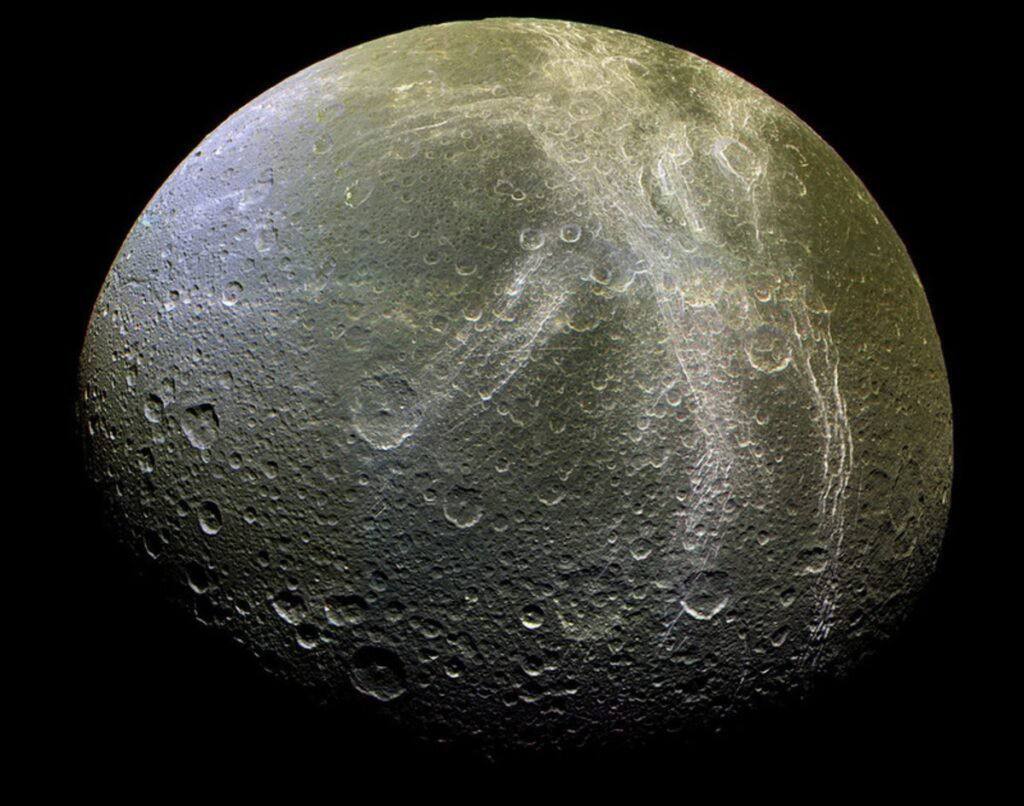 🪐🌑 Диона на фоне тонкой полоски колец Сатурна, а также её поверхность