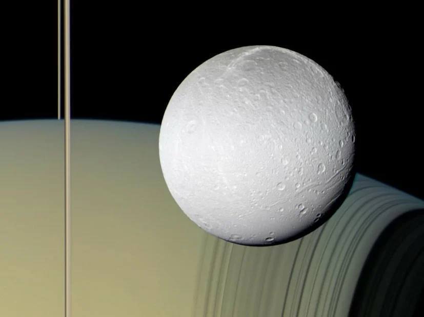 🪐🌑 Диона на фоне тонкой полоски колец Сатурна, а также её поверхность.