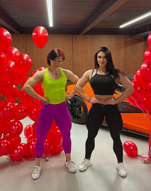 У нее плечи шире чем у ее тренера с каштановыми волосами...)))