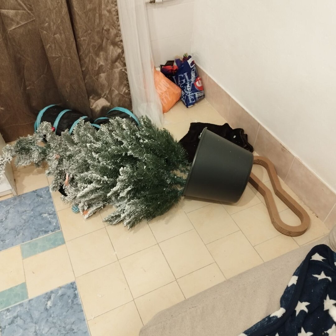 Нас со старшим котом не было дома полдня. Ёлка была привязана к трубе. Два килограмма шилопопия таки справились. Периодически он продолжает лезть к ёлке, получает очередное "пщщ" водой и уходит.