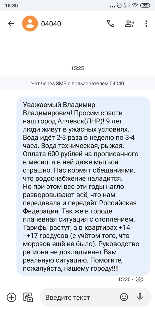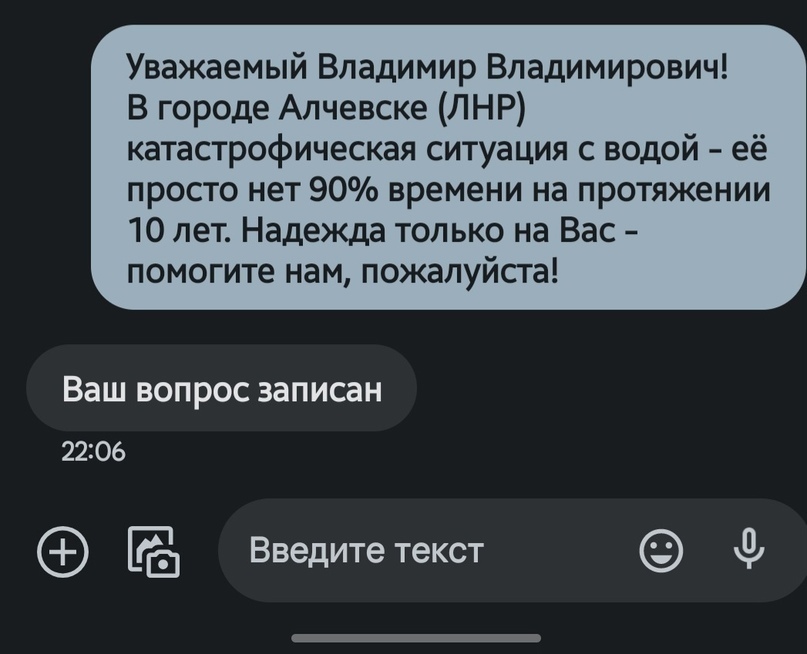 А при чем тут я и мой подъезд? Жители Алчевска обратились к Путину, что у них воды нет. А Галина советует в вышестоящие инстанции жаловаться. Ты читать не умеешь?