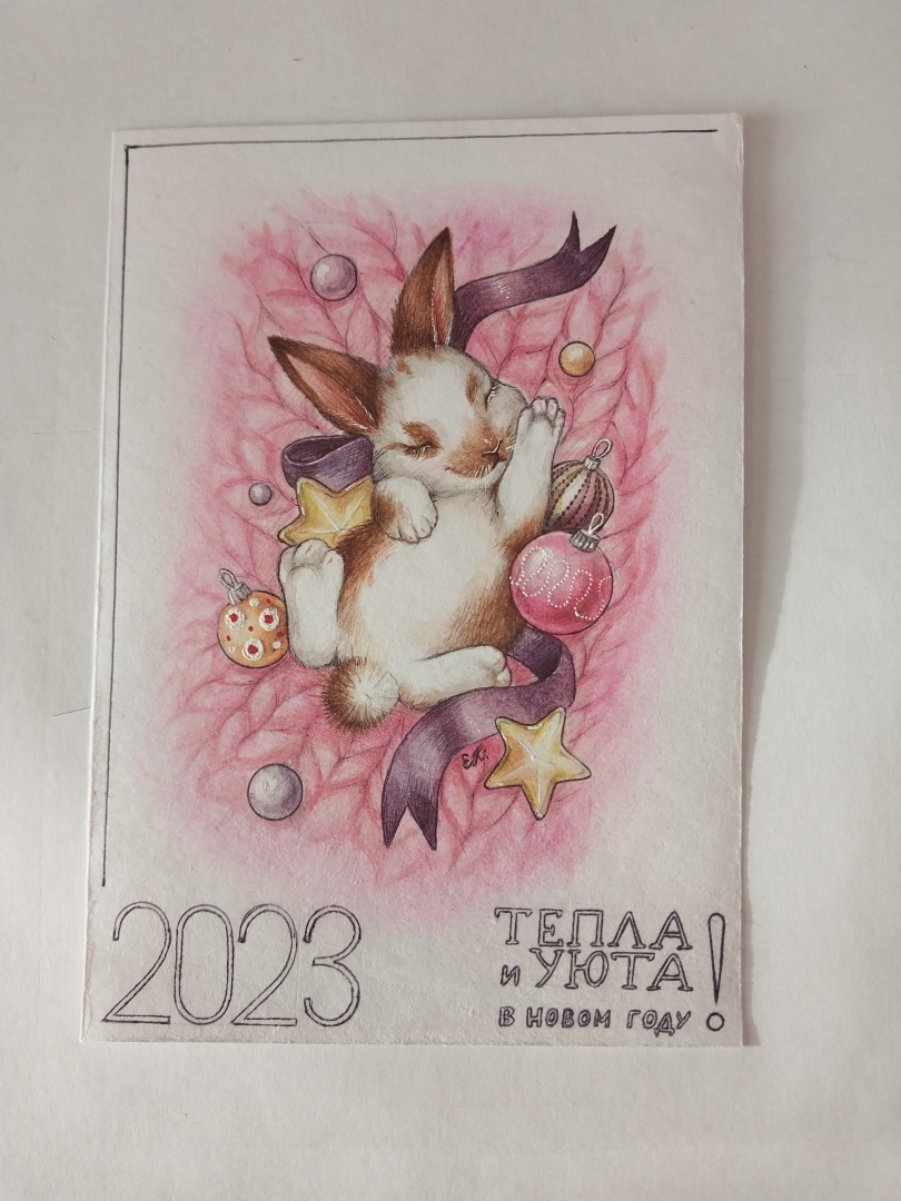 А это прошлогодняя открытка, тоже подарок близкому. Здесь я рисовала карандашом и акварелью, цифры и надпись - чёрная ручка.