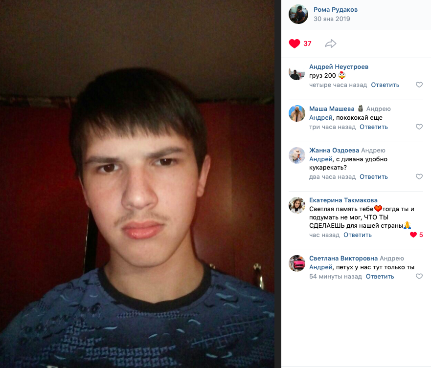 Читая комментарии недоумков, которые пишут "груз 200", думаешь: а люди ли они? Что есть в них человеческого? Где сострадание? Я всегда нахожусь в шоке от такого рода комментариев, ведь их могут прочитать родные и близкие... Ужасно! Как можно целенаправленно наносить людям БОЛЬ своими словами, в то время когда необходима обыкновенная моральная поддержка! Да, парня не вернуть... Но, добрые и тёплые слова смогут хоть как-то утешить боль...