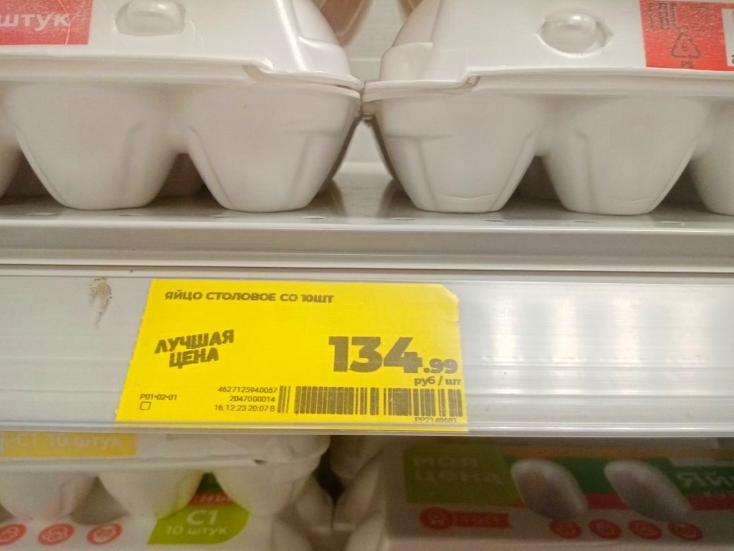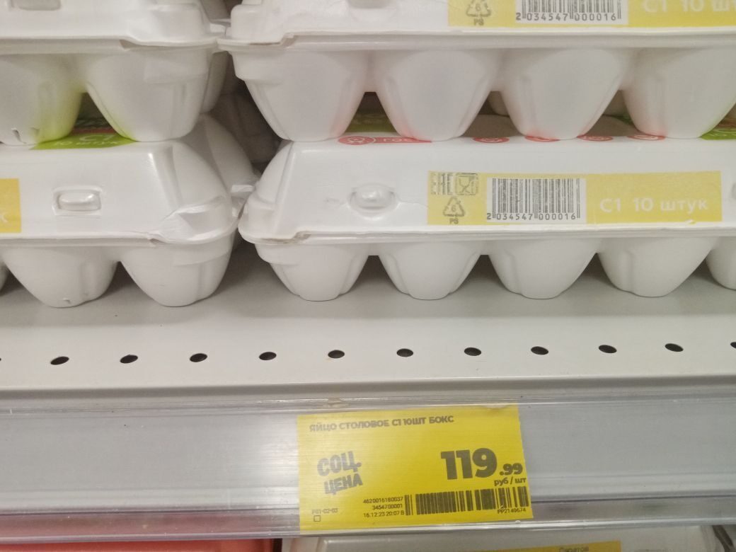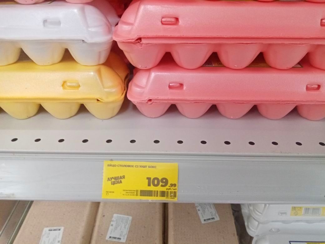 Ну и конечно, не могла обойти стороной пресловутые яйца. Они, как и во многих других регионах, от 109.99 руб. и выше.