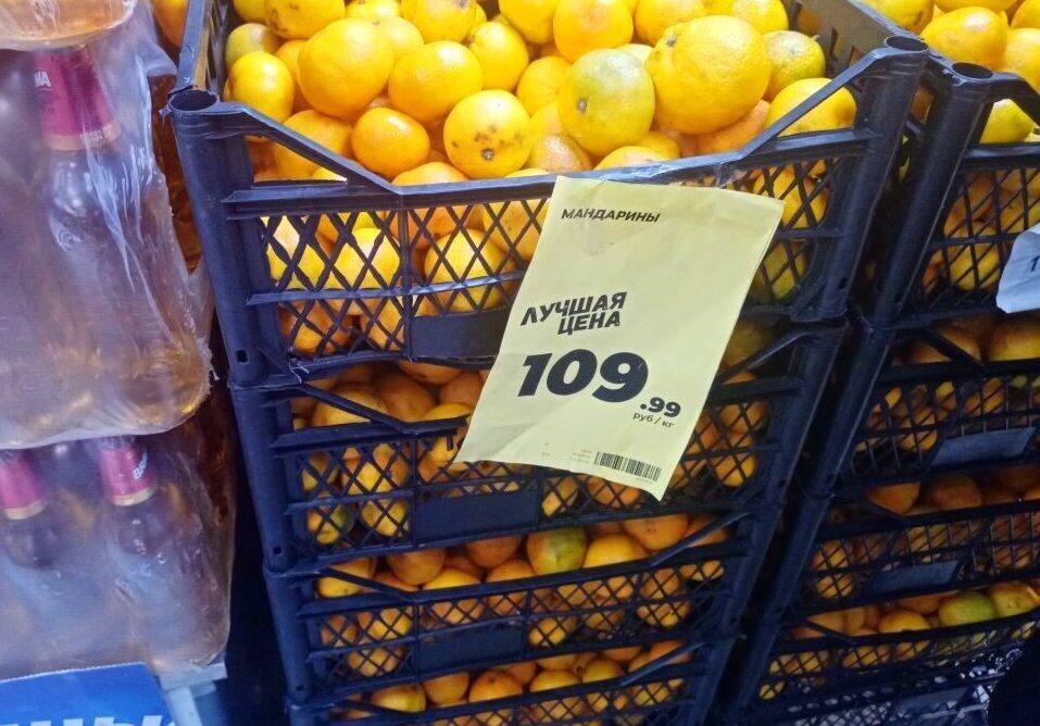 Ну и конечно, мандарины. Три разных сорта — три разных цены. Самые дешёвые по 109.99 руб. Их берут хорошо.