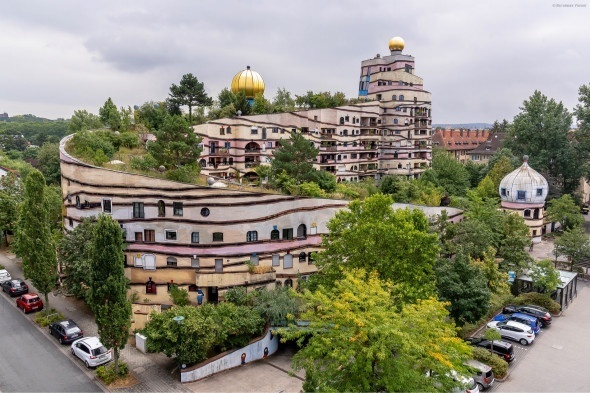 И уже последнее здание началось строиться в 1998 году, и закончили его строить через два года, после смерти Хундертвассера. В здании 105 квартир с ресторанами, кафе и барами, позолоченные купола на крыше. А внутри дома находится игровая площадка и искусственный пруд.