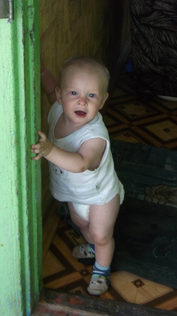 Выход из дома шёл через кухню. Сначала попадаем на веранду, потом на улицу. Обе двери плотные. Годовалому ребёнку не под силу. Конечно, на тот момент ему было около 11 месяцев. Пошёл с опорой вообще к 6. У мальчиков, оказывается, это норма. Начал бы ходить в 9, но при первых шагах его напугала бабушка. Громко воскликнула, пока он ходил от меня к отцу. Брякнулся на попу и с тех пор боялся самостоятельно ходить.