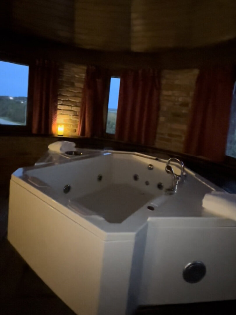 А в чем же романтика? Дык в винтовой лестнице, которая ведёт в башню с джакузи, но зимой принять ванну проблематично, в помещении холодно.