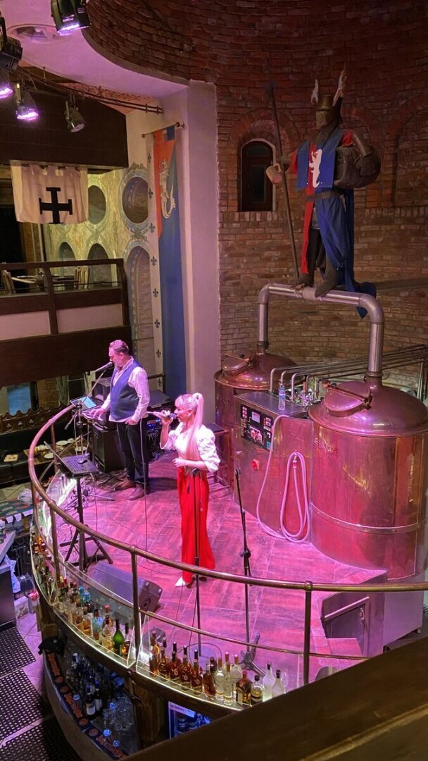 За баром находилась сцена с артистами. А за ними... пивные бочки, это и понятно, в ресторане собственная пивоварня.
