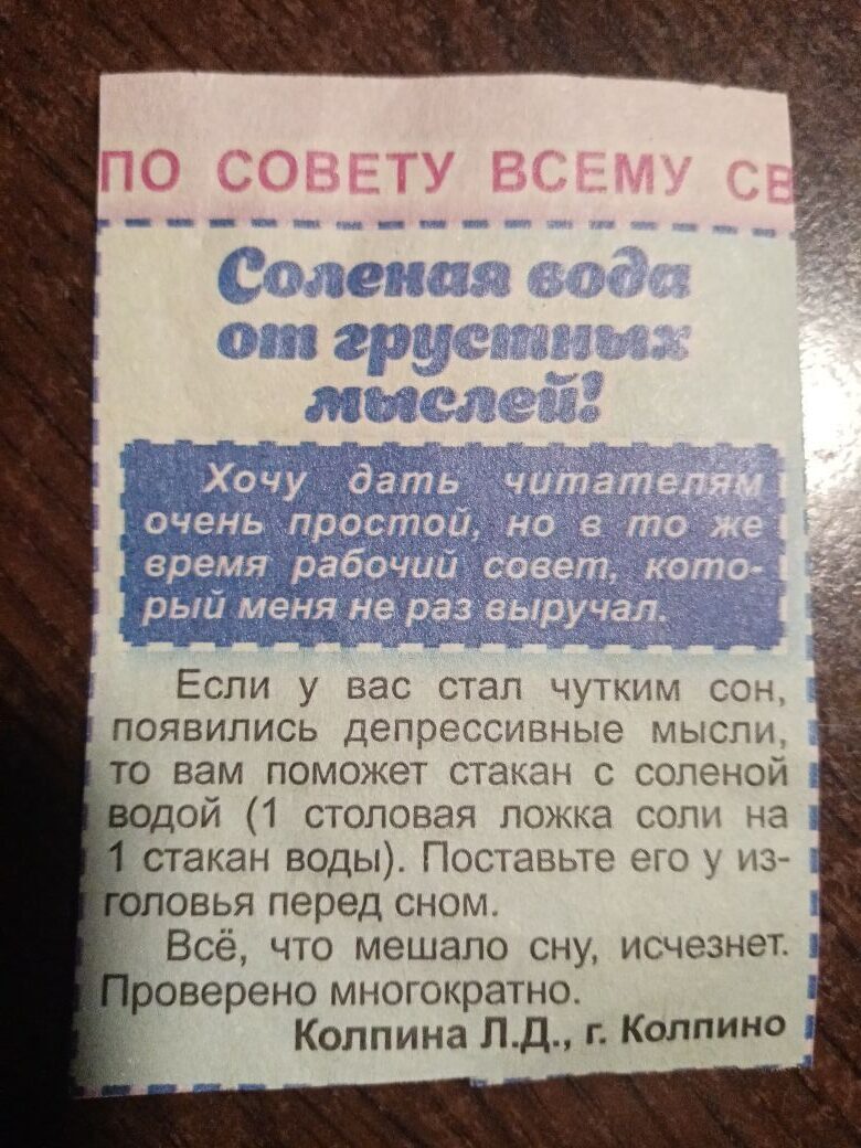 И тут я вдруг вспомнила об одной заметке из какого-то женского журнала. Я когда старые журналы выбрасываю, всегда их просматриваю, а некоторые полезные советы вырезаю и храню до поры до времени. Так вот, в этой вырезке говорилось о том, как солёная вода помогает при нарушениях сна.