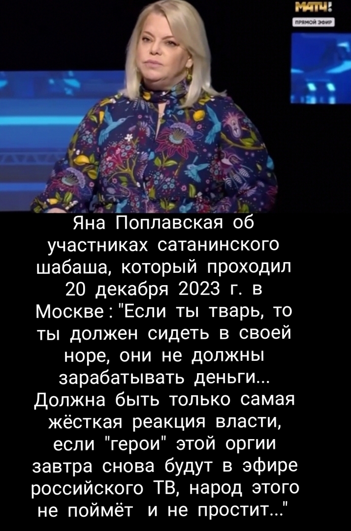 Яна Поплавская об участниках сатанинского бала нечисти в Московском клубе "Мутабор решительно и правильно высказалась : "Если ты тварь, то ты должен сидеть в своей норе, они не должны зарабатывать деньги. Должна быть только самая жёсткая реакция власти. Если "герои" этой оргии завтра снова будут в эфире российского ТВ, народ этого не поймёт и не простит. "Песня года", "Голубые огоньки", этих лиц там не может быть по определению. "Голубой огонек" уже прошел для них в Мутаборе".