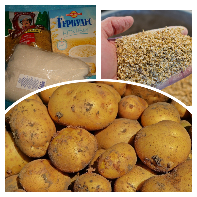 Кроме этого ему в кашу добавляем геркулес, манку, вермишель, тертый (пока) картофель, несколько горстей посыпки (молотое зерно), немного сала или мясного отвара, а также немного подслащиваем. Также покупаем сухое молоко.