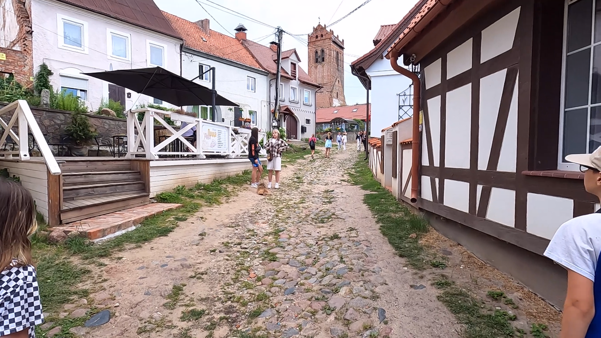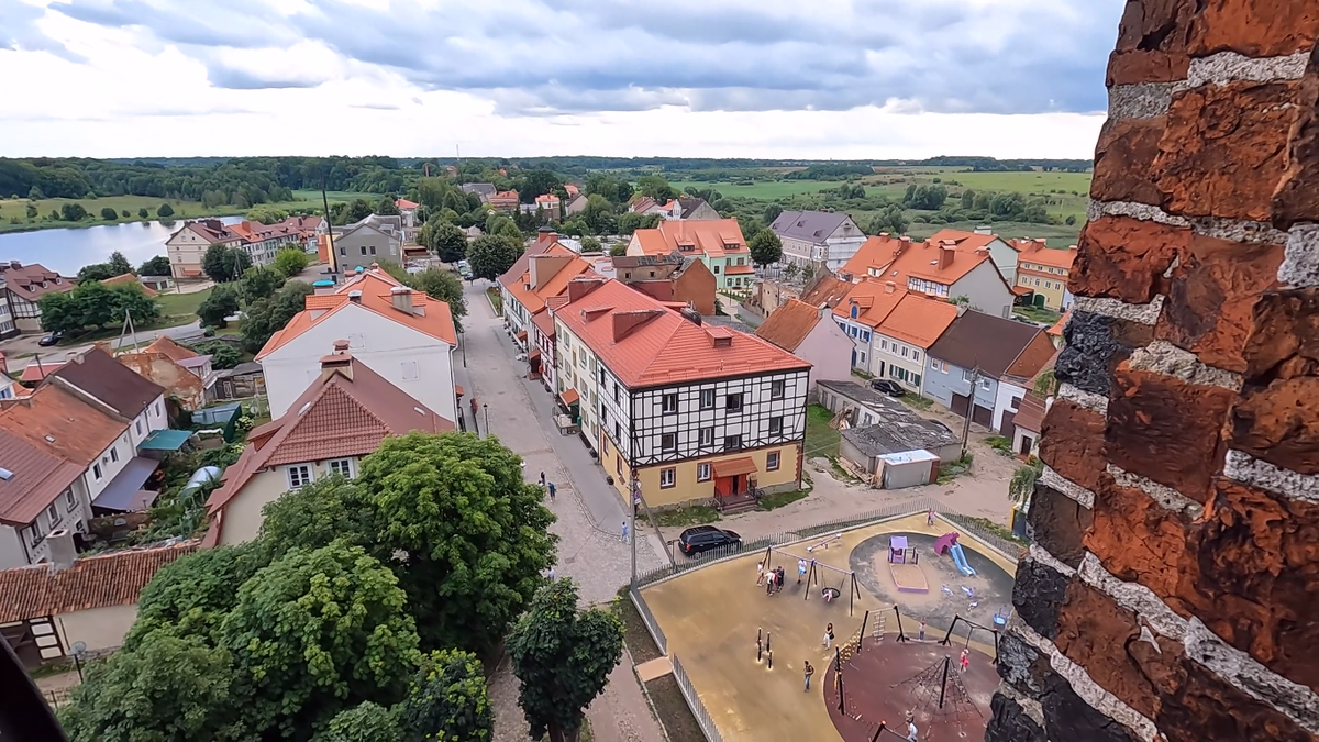Наша экскурсия началась с центральной улицы, которая упиралась в старинную кирху. Сама кирха находилась в стадии ремонта, но для туристов открыли смотровую площадку. Цена - 100р. Можно подняться наверх по крутой винтовой лестнице и любоваться просторами Gerdauen. Мы с мужем рискнули. Ребёнок остался внизу. Дыры в стенах и полу... Вообщем, аттракцион не для слабонервных, но оно того стоило!