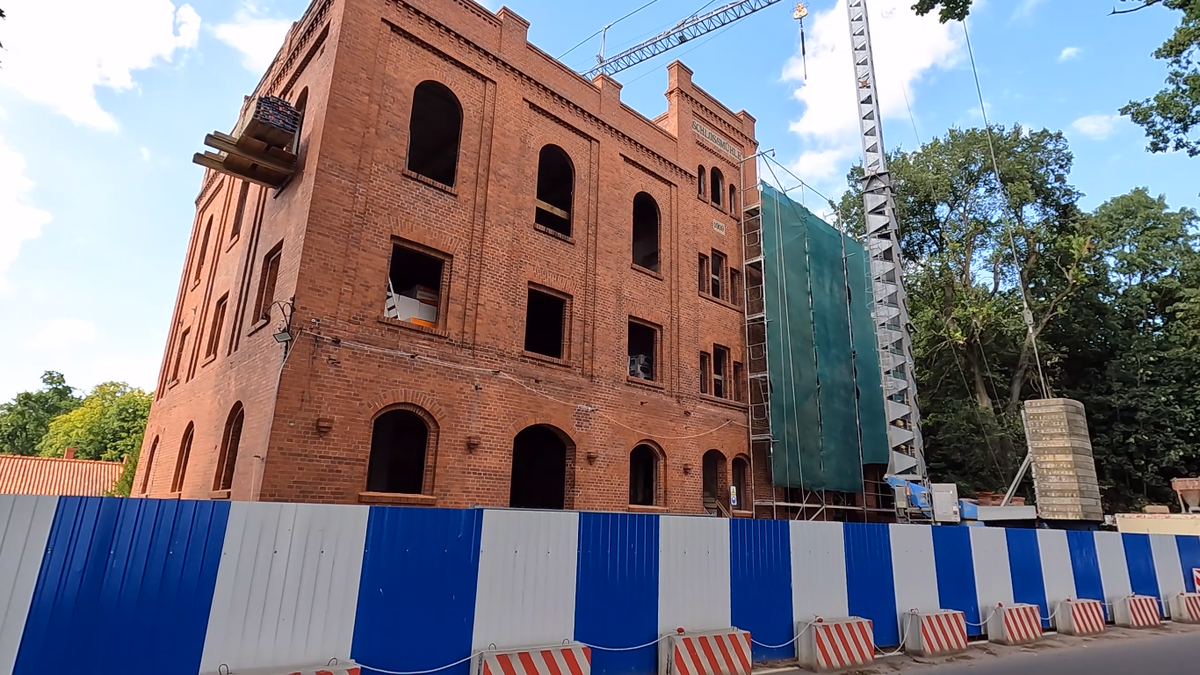 Через 10 минут мы всё же добрели до Водяной мельницы. Старинное, трёхэтажное немецкое здание из красного кирпича, построено в начале 20 века. На наших глазах шёл капитальный ремонт. Рядом гуляли местные жители, они то и поведали, что после реставрации, здание отойдёт какому-то частнику, а тот пообещал соорудить гостиницу. Ну что же. Хочется верить.
