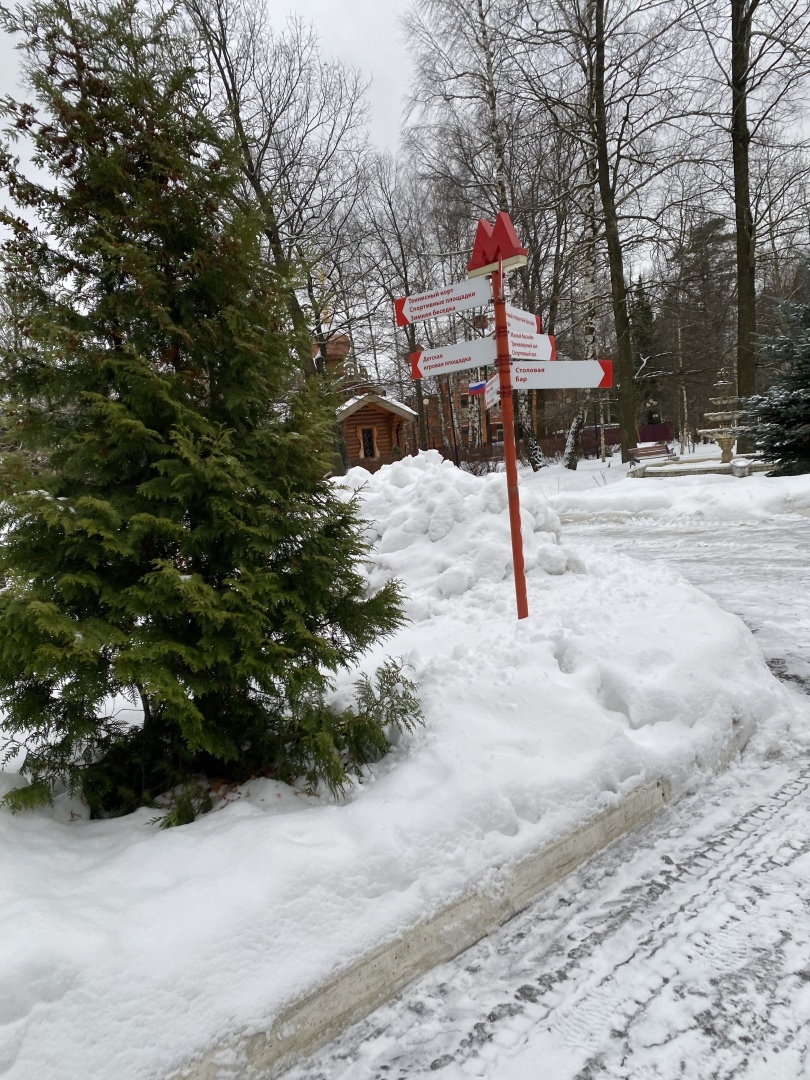 По пути мы увидели чищенные дороги и указатели, территория имеет красивые деревья и постройки:
