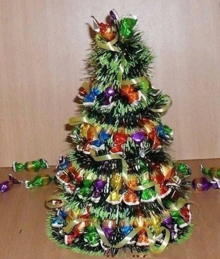 Я дарю подарки только самым близким людям (родственникам и друзьям). А сотрудникам мы с дочерью делаем такие елочки: из мишуры и конфет. Два в одном : и время приятно провели (мы когда делаем ёлки, включаем какой нибудь добрый семейный фильм) и сувенирчиков сладких наделали. Сослуживцы ставят такую елочку на рабочий стол и сразу новогоднее настроение появляется