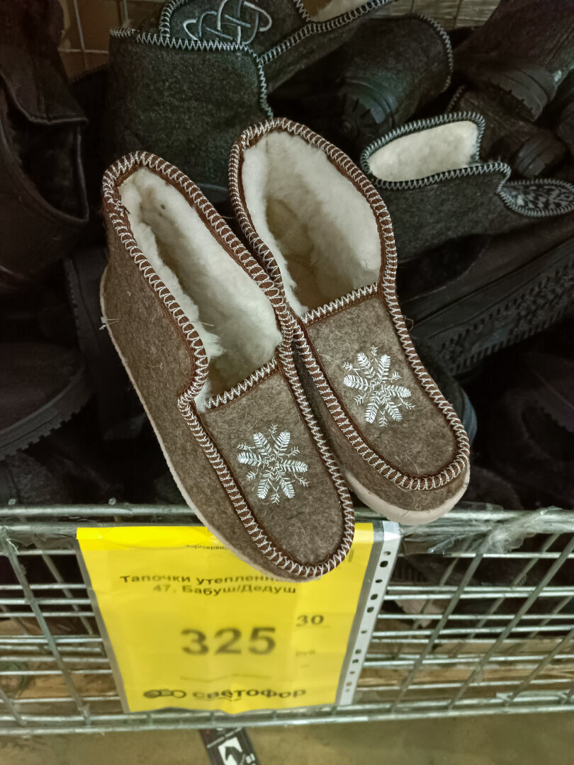 Взяли носки 5 пар за 140 рублей. Маме - тапочки "прощай молодость" за 325 руб и стиральный порошок за 417 рублей. Всё!