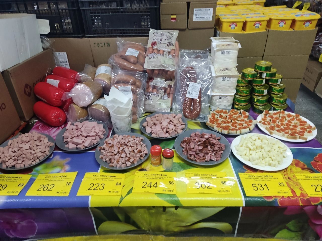 Шок! Матерь Божья! Как в лучших домах Лондона и Парижа! Впервые увидела дегустацию в "Светофоре"! Где-где, но только не там! Первая мысль: люди не берут эти мясные "деликатесы", не доверяют качеству, поэтому решили дать попробовать на халяву! А мы что? Мы не гордые, и главное - голодные))