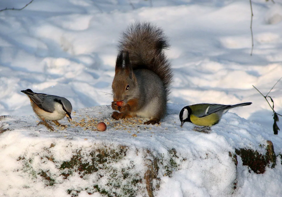 Было занимательно наблюдать, как птицы бросаются за семечками и орешками, и ловко их утаскивают в своих клювиках, а некоторые из птах даже вступали в борьбу за лакомый кусочек орешка.