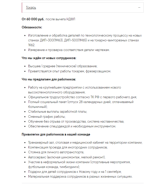 Вот скрин с сайта нашей компании. Столько и получаю. По сравнению с прошлой работой это в трое больше. Кроме того, завод выплачивает 10000 руп. тому работнику, кто приведет на завод рабочего механической специальности, токаря, фрезеровщика, сверловщика. Иногородним доплачивают так называемые дорожные. А молодежи, так им такую бы работу, чтоб поменьше работы.