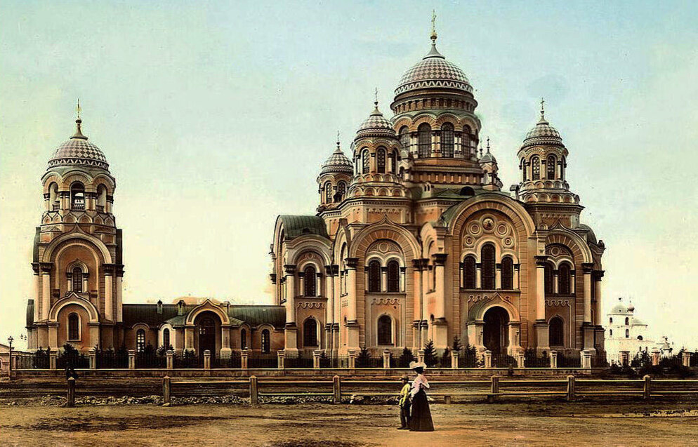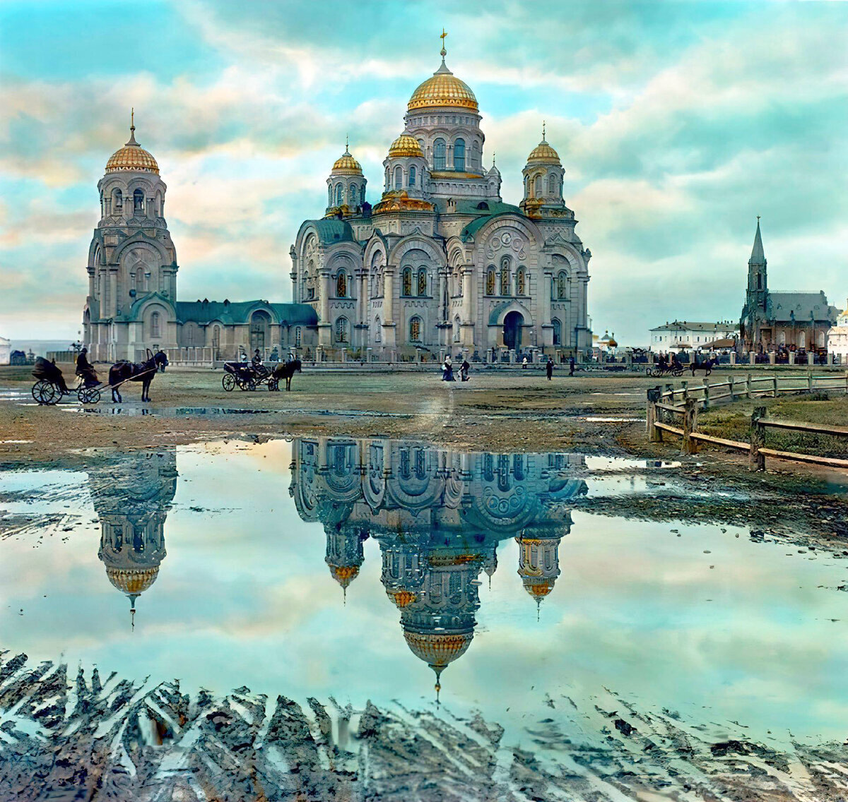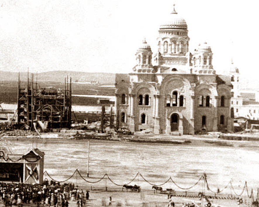 Иркутский кафедральный собор в 1901 году. Этот снимок был сделан американским фотографом Бертоном Холмсом во время его путешествия по Транссибу. Холмс снимал на различные пленки и автоматические негативы. Фотография была сделана на стеклянной пластине и, возможно, раскрашена вручную. Оригинал, возможно, хранится в коллекции автоматических цветных фотографий Бертона Холмса в США.