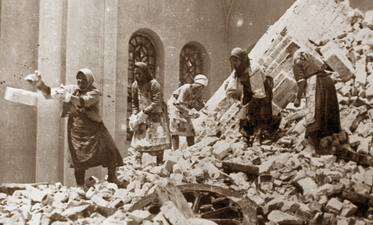 ...... Разбомбленный собор упорно сопротивлялся разрушению. Кирпичи в стенах были скреплены раствором так крепко, что их было легче сломать, чем разорвать. Долгое время на месте церкви лежали обломки и бесполезный металлолом. Хорошие обломки и кирпичи использовали для мясной бойни на площади. Стены собора были освобождены, и вскоре здесь появились заколоченные досками временные дома и лачуги.