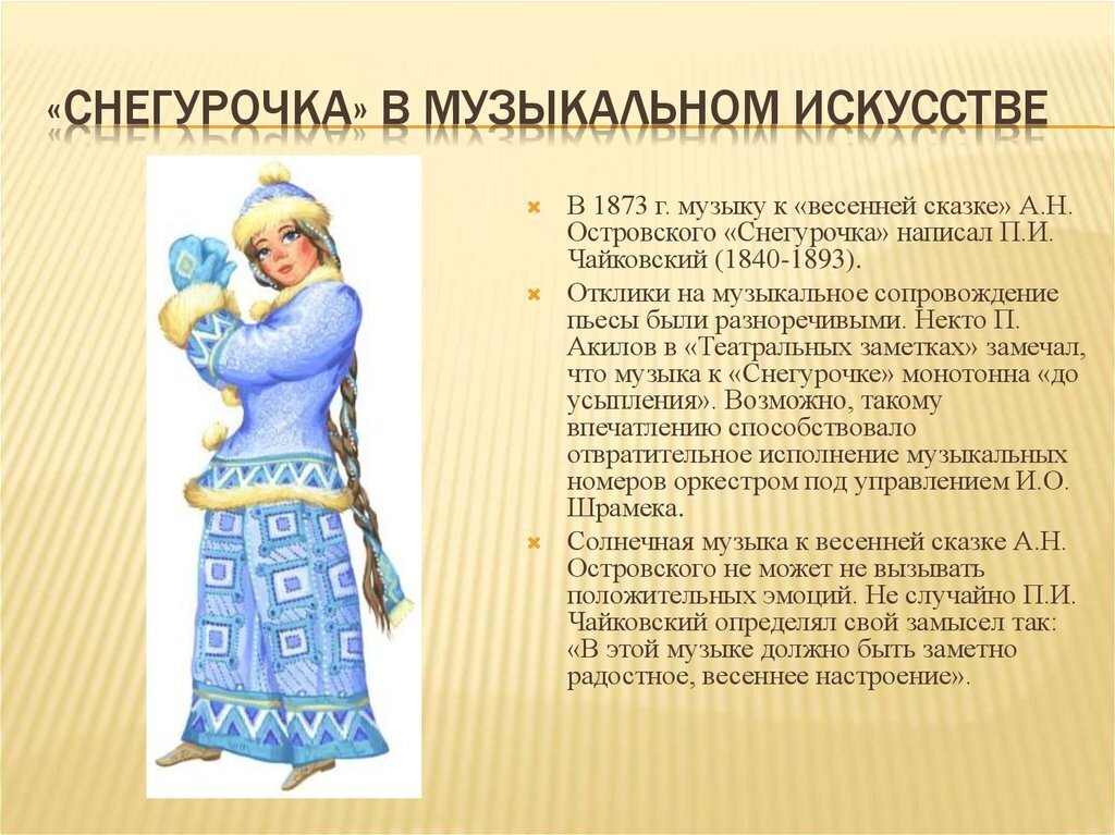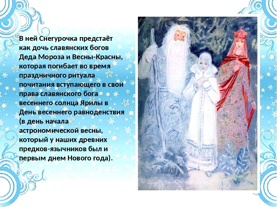 Социальный психолог Людмила Андреевна Сызранова: "А на Ваш взгляд, какими словами тогда назвать, например, авторов шедевров русской классики?". Как успешное коммерческое воплощение в литературном и музыкальном произведениях мифологического народного образа в виде пойкилотермной девицы, уже утвердившегося в печатном слове стараниями М.Максимовича. Но замечу, наша дискуссия началась после Вашего "Образ внучки Деда Мороза придумали Лев Кассиль и Сергей Михалков", однако Вы пытаетесь этот странный тезис перевести, на мой взгляд неудачно, в обсуждение художественных достоинств произведений А.Островского и П.Чайковского. P.S. Несомненно, А.Островский выдающийся драматург, но с пресловутой "Снегурочкой" у него получился явный "прокол". Начнём с завязки: "Холодом встречает Весну страна берендеев, а все из-за заигрываний Весны с Морозом, старым дедом, признается сама Весна. Родилась у них дочка — Снегурочка" (текст не мой, а литературоведа Е.П.Сударевой). Бог с ней, Весной лёгкого поведения и её "папиком" Морозом, но дальше текст "весенней сказки" превращается в мешанину событий со всеми этими Мизгирями, Лелями, Бермятами, Мурашами, Бобылями и прочими Берендеями на полтора часа чтения. Может быть поэтому в списке рекомендованной школьникам литературы числится не "Снегурочка", но "Всадник без головы" М.Рида? P.P.S. Только для ценителей волшебных сказок - С Рождеством Иисуса Иосифовича Плотникова!