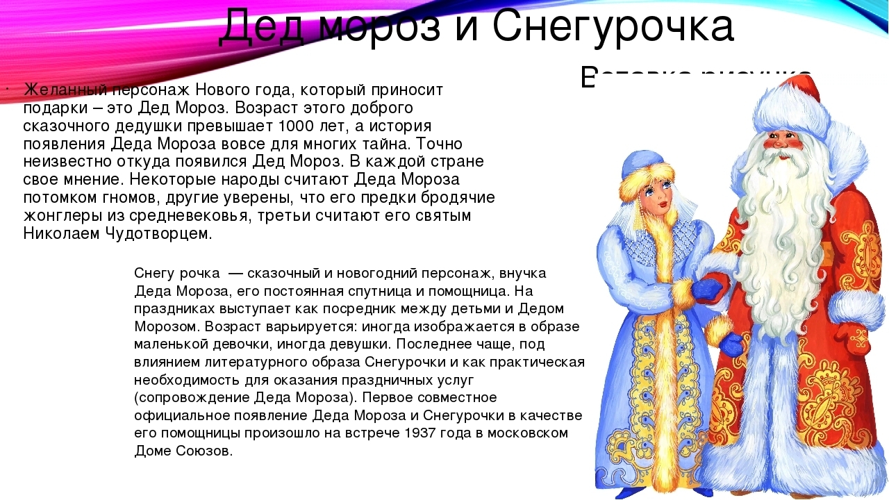 "Впервые зимний волшебник и его помощница — внучка Снегурочка — появились перед советскими детьми на празднике ёлки в московском Доме Союзов в 1937 году.