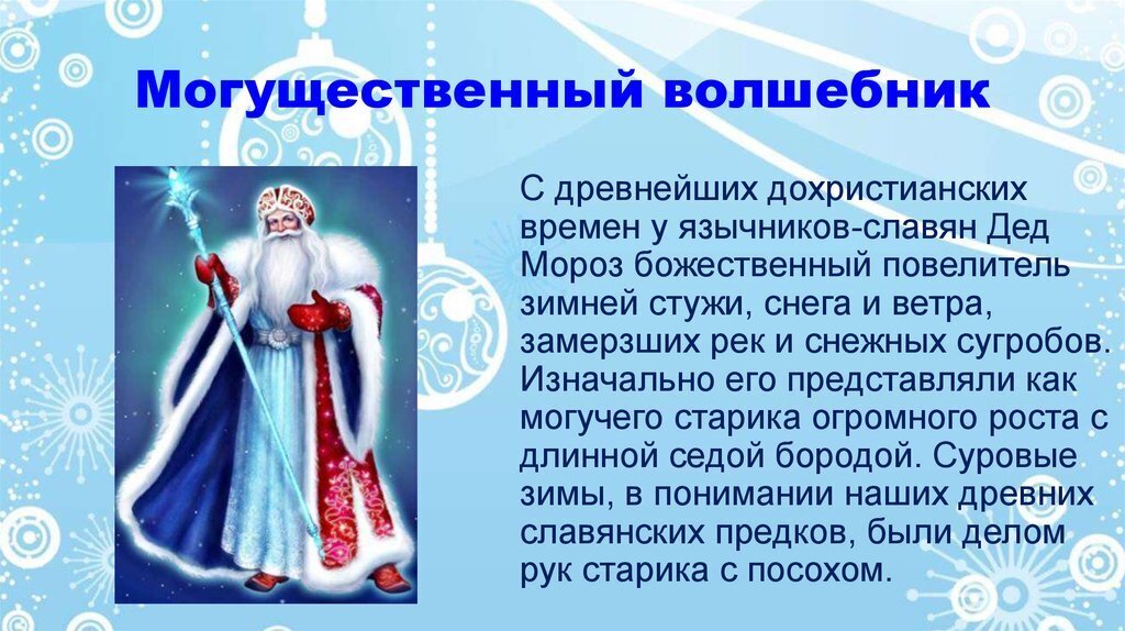 "Историки склонны считать, что прототипом нашего Деда Мороза был восточнославянский дух холода Трескун, или, как его еще называли, Студенец. Больше похож на нашего Деда Мороза персонаж старинных сказок Морозко, в более поздних версиях - Мороз Иванович, Мороз Елкич. Это Дух Зимы - строгий, иногда злой, сварливый, но справедливый. Хорошим людям благоволит и одаривает, а плохих может и заморозить своим волшебным посохом.
