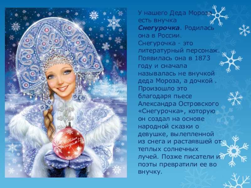 Сначала появился добрый сказочный дедушка Мороз, потом, уже в советское время, дед Мороз и его внучка Снегурочка стали обязательными персонажами новогоднего спектакля. Снегурочка сначала была маленькой девочкой, потом, как-то так незаметно получилось, предстала в образе девушки, с тех пор так и повелось: Дедушка Мороз и его внучка Снегурочка.