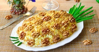 Этот салат с курицей, грибами, ананасом и грецкими орехами не только прекрасно выглядит, но
